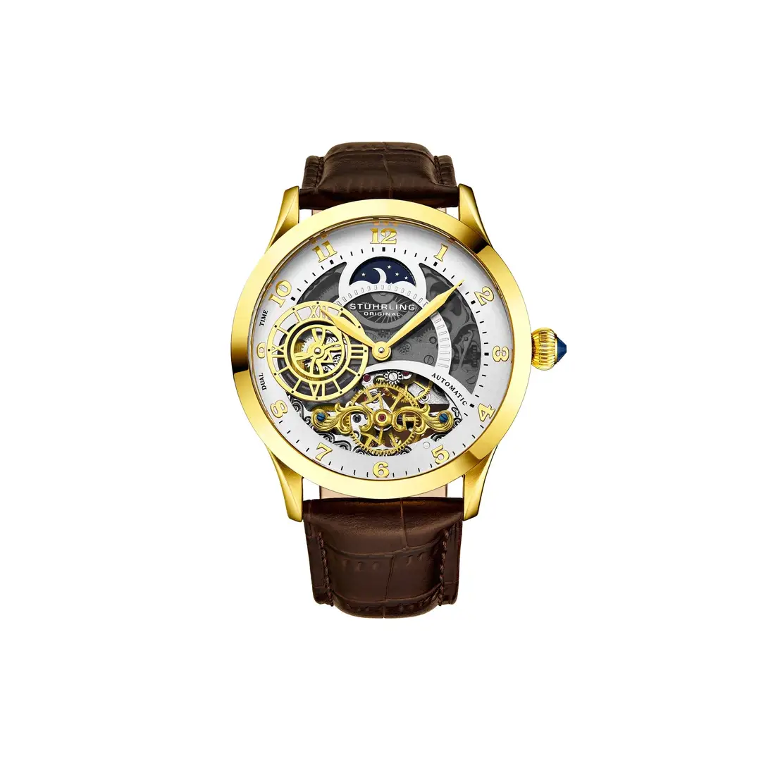 Dial i hapur skeletonized, i mbuluar me xham të nuancuar, me nën-dial të detajuar për zonën e dytë kohore dhe tregues AM/PM – një dizajn që të magjeps në çdo shikim.